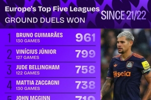 体育资讯9月11日讯 Squawka统计了2021-2022赛季以来球员在五大联赛地面对抗成功的次数,并列出榜单,吉马良斯961次居首,维尼修斯、贝林厄姆二三位。