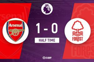 半场结束,阿森纳暂1-0诺丁汉森林。