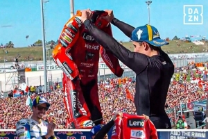 体育资讯9月15日讯 在本周的MotoGP圣马力诺站的比赛中,杜卡迪车队的马奎斯夺得P1,在赛后的颁奖典礼上,马奎斯脱下了他的赛车服来庆祝。