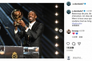 登贝莱在个人社媒也晒出手捧奖杯的照片,配文写道:“这一刻情绪万千,无比开心与骄傲。我的一个梦想实现了,感谢一路走来一直支持我的所有人!”