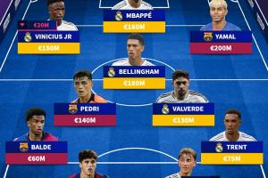 前锋:维尼修斯-1.5亿欧,姆巴佩-1.8亿欧,亚马尔-2亿欧
