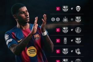 欧冠联赛阶段第3轮,巴萨6-1奥林匹亚科斯,拉什福德梅开二度